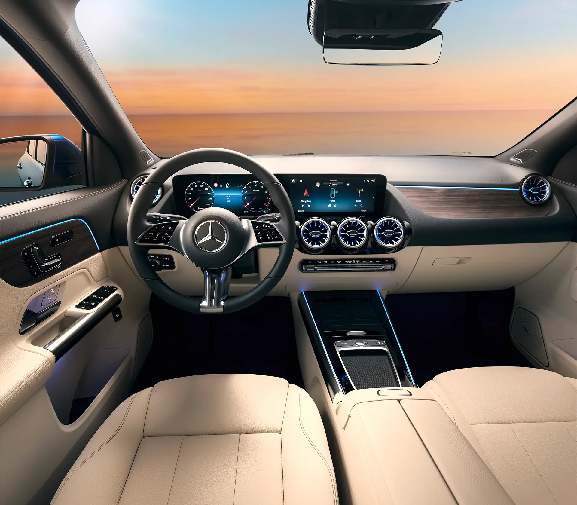 Beim MBUX Hyperscreen gehen drei Displays scheinbar nahtlos ineinander über und bilden ein 141 Zentimeter breiten und gewölbten Bildschirm. Die gebogene Fläche ermöglicht den verzerrungsfreien Blick auf die Displayeinheit über die gesamte Fahrzeugbreite.