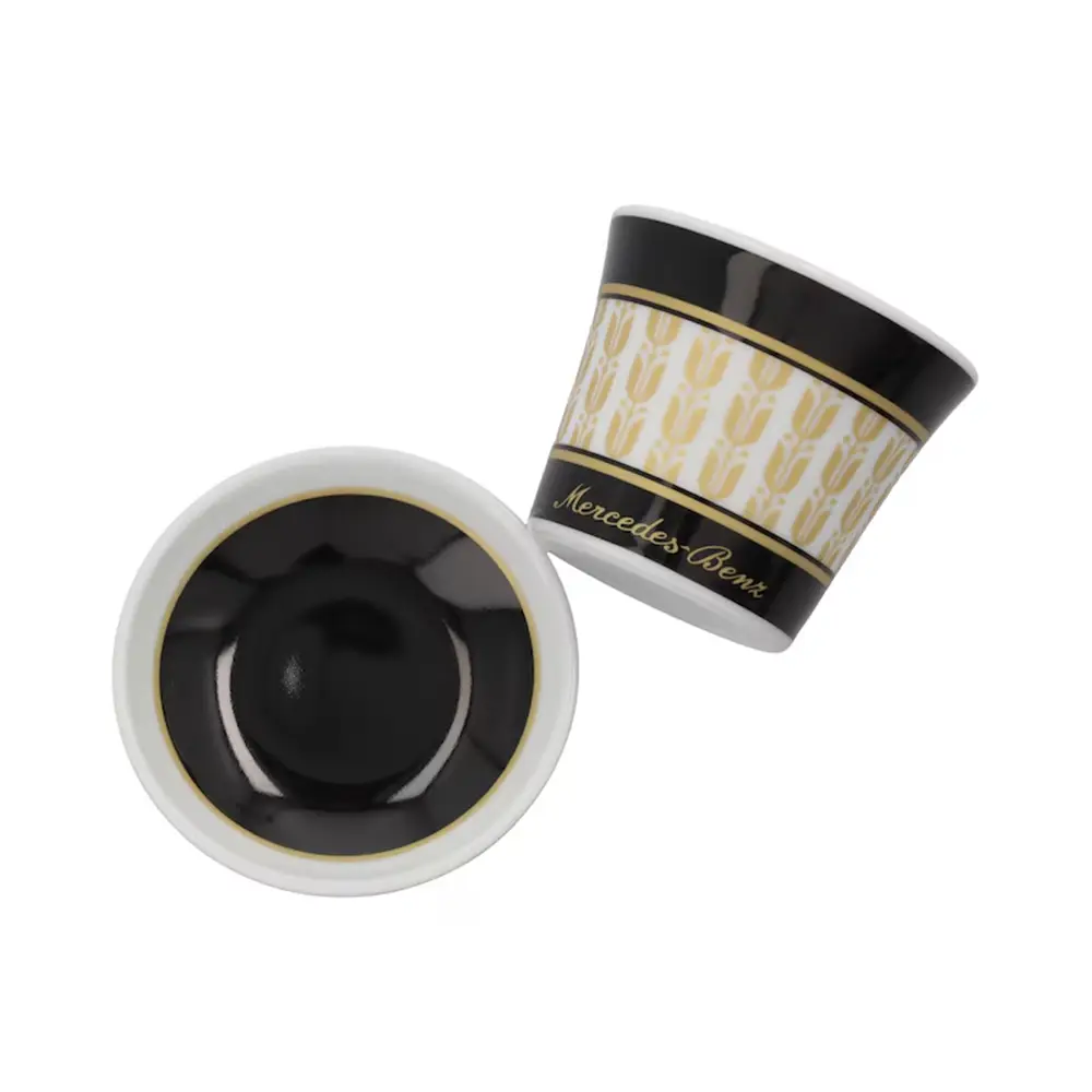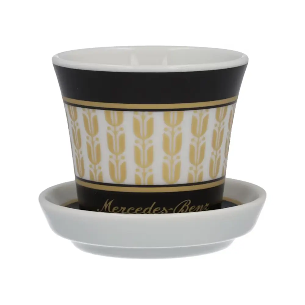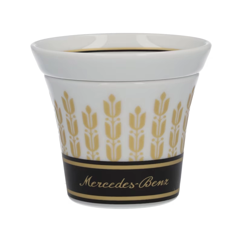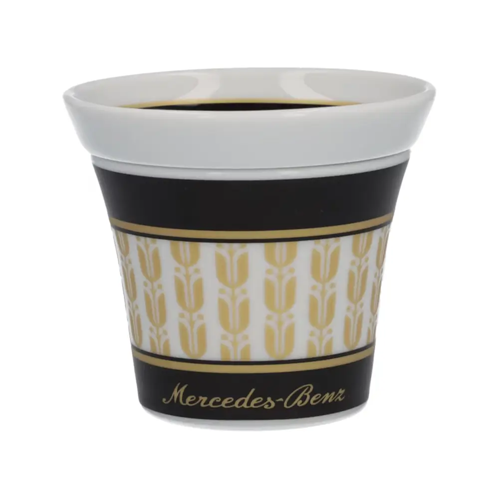 Stilvoller Kaffeegenuss – das 4-teilige Espressotassen-Set aus hochwertigem, veganem Porzellan vereint edles Design mit Funktionalität. Die henkellosen Tassen in Schwarz und Weiß sind mit goldenen Lorbeerblättern und einem Mercedes-Benz Schriftzug verziert. Die passenden Untertassen dienen zugleich als Deckel. Dank spülmaschinengeeigneter Verarbeitung ist das Set besonders pflegeleicht.