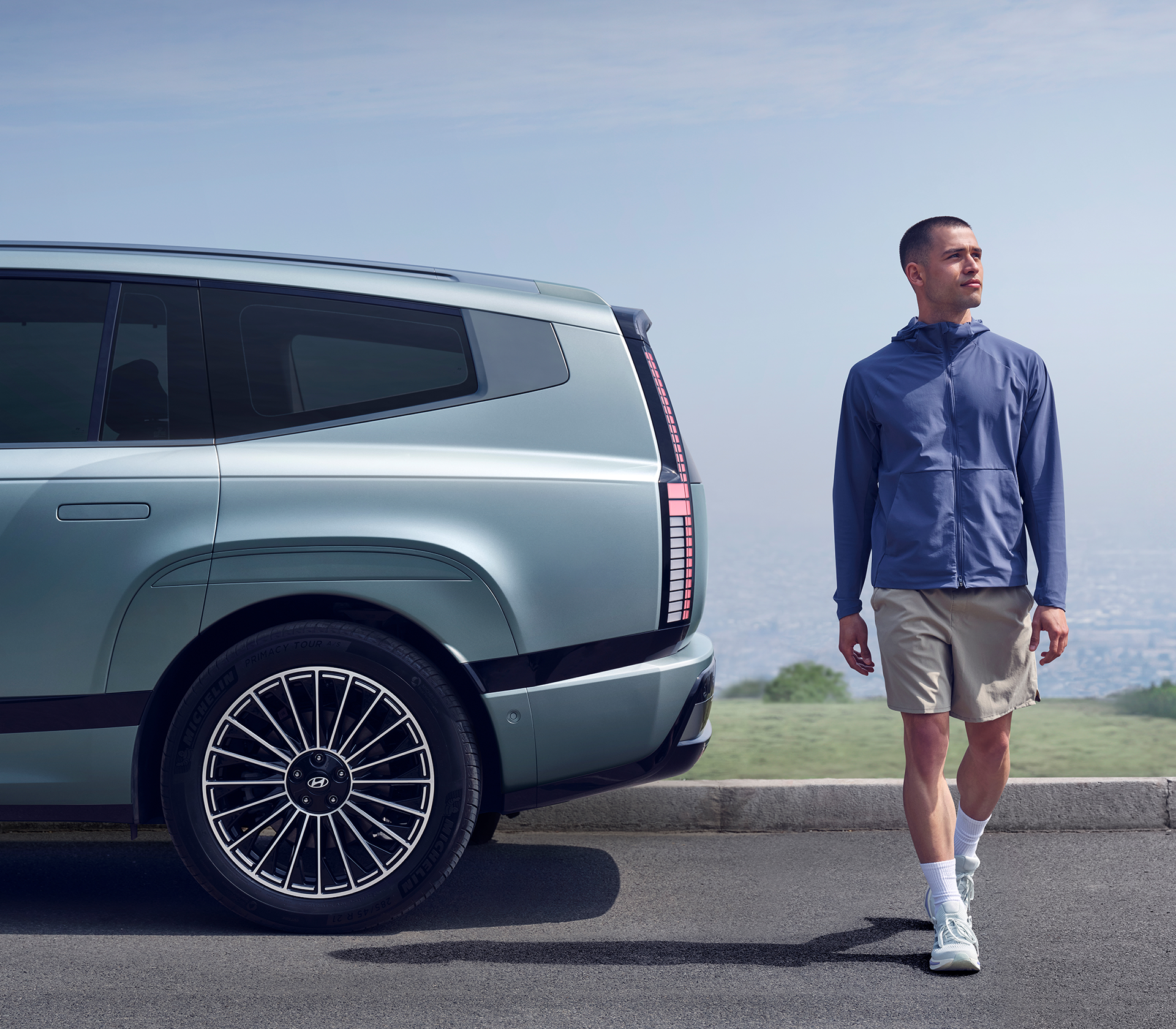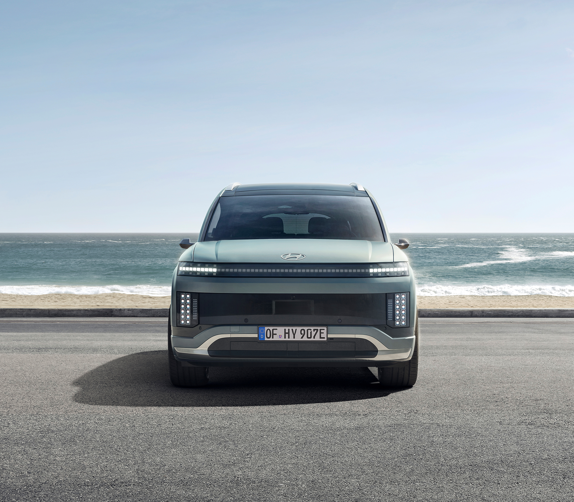 Das äußere Erscheinungsbild des Hyundai IONIQ 9 kombiniert geschickt aerodynamische Innovation mit einem futuristischen und eleganten Design. Die markante Front des Fahrzeugs, die durch das parametrische Pixeldesign geprägt ist, zieht sofort alle Blicke auf sich. Die geschwungene Dachlinie und der bemerkenswerte Luftwiderstandsbeiwert von nur 0,26 (bei digitalen Seitenspiegeln) verdeutlichen die technische Raffinesse, die hinter diesem Modell steckt.