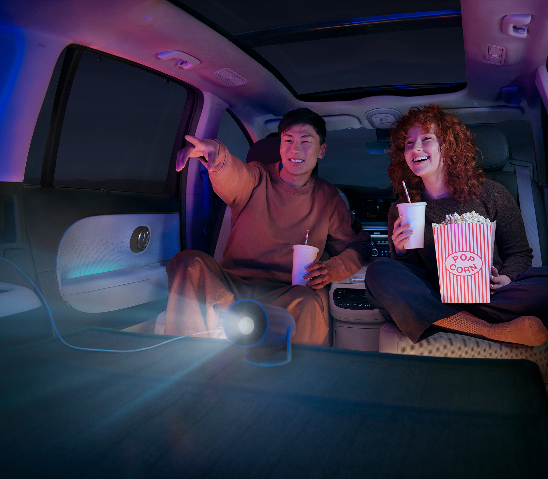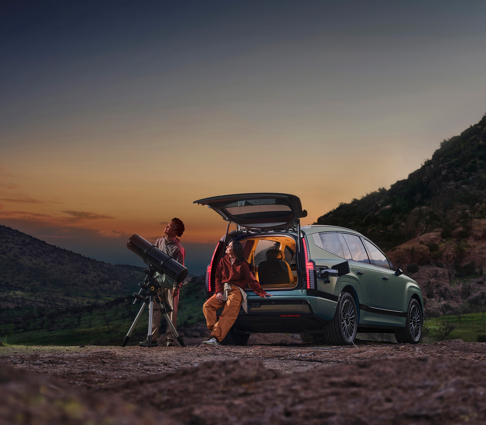 Hyundai IONIQ 9 Heckansicht zwie Personen schauen aus dem Kofferaum mit Fernglas in die Sterne