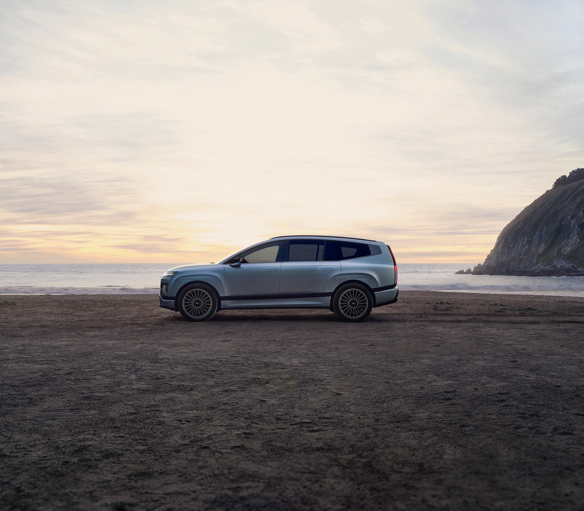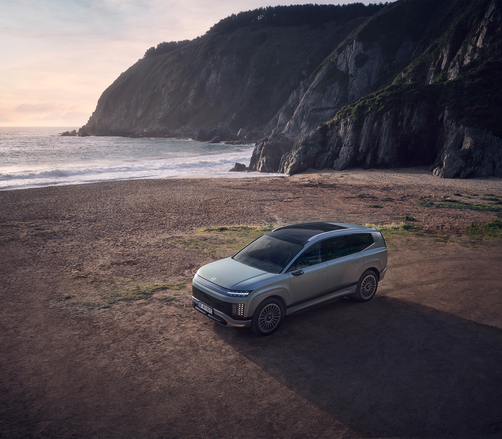 Hyundai IONIQ 9 von oben an einem Strand mit Felsen und dem Meer im Hintergrund