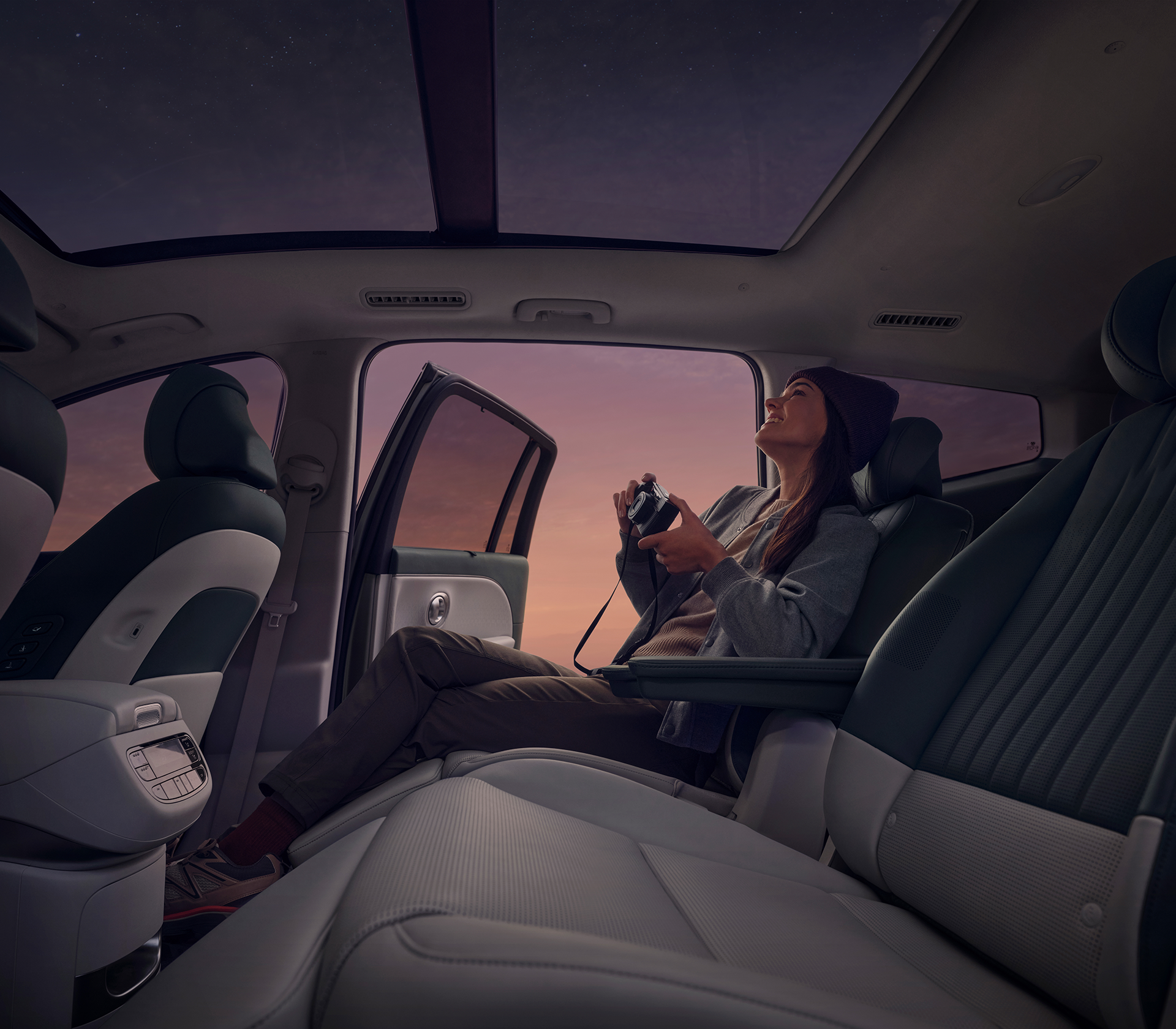 Hyundai IONIQ 9 Innenansichder Sitze und eine Frau, die bei Nacht durch das Panoramadach in die Sterne guckt und eine Kamera in der Hand hält