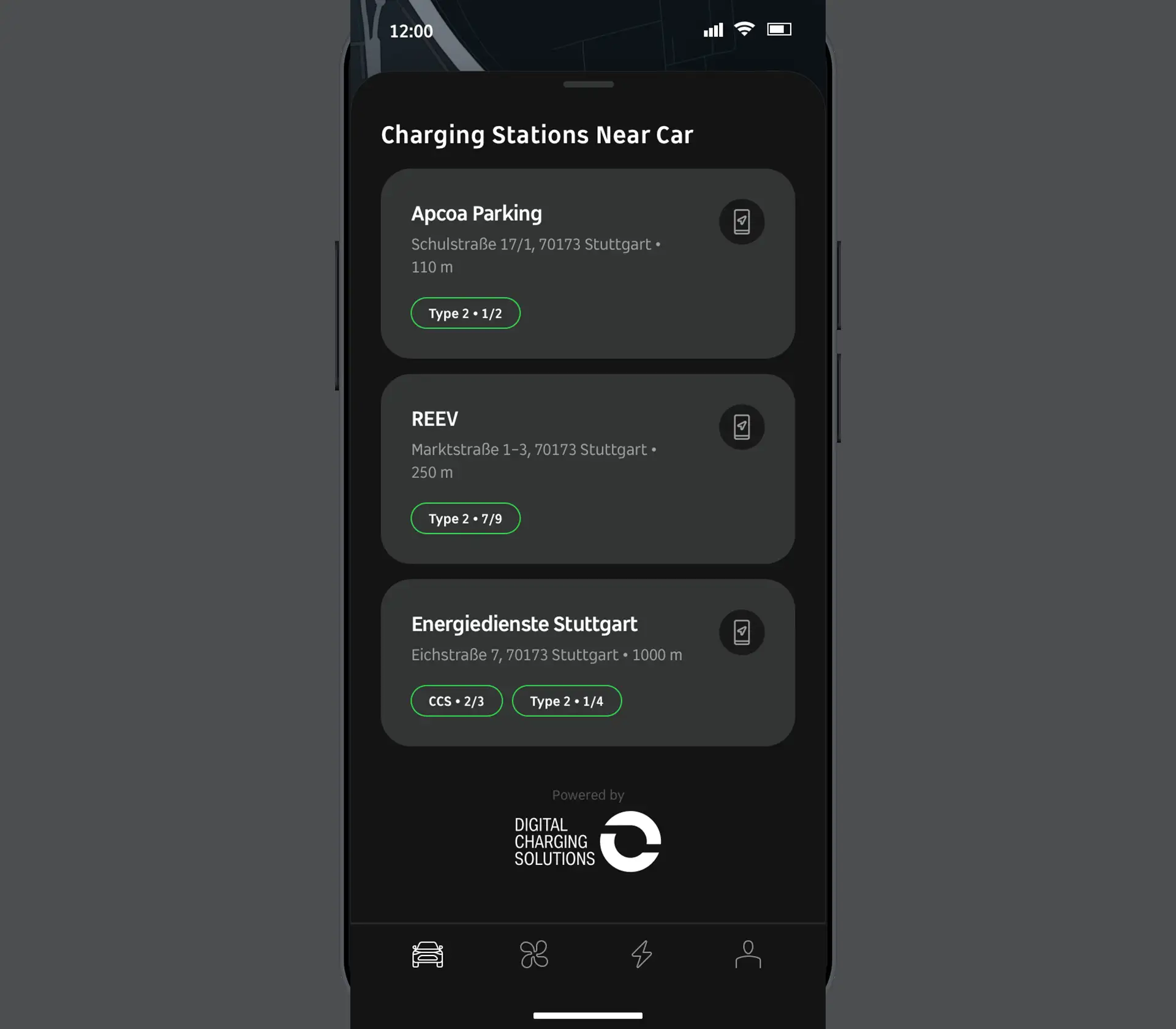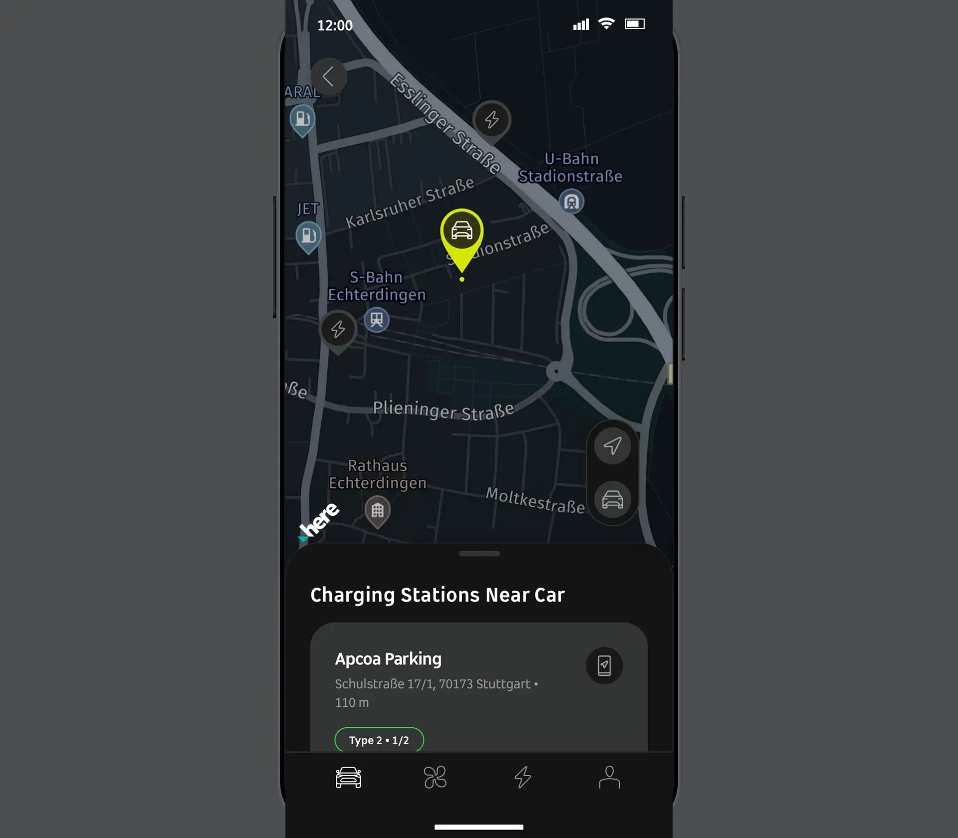 Verfügbare Ladestationen in der Nähe ausfindig machen und Preisinformationen aufrufen.