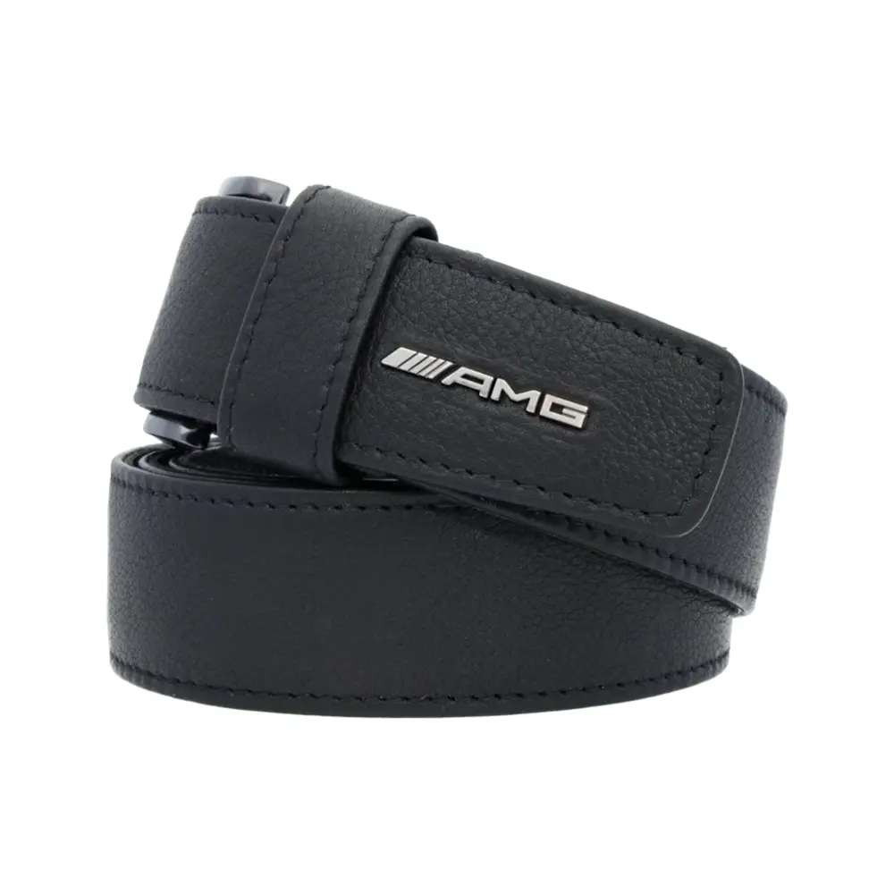 Ein stilvolles Accessoire für jeden Anlass: Der Mercedes-Benz AMG Gürtel aus hochwertigem schwarzem Rindleder überzeugt mit edler Narbung und einer markanten AMG Logoniete im Gun-Metal-Finish. Dank einer kleinen Drehschraube lässt sich der Gürtel individuell kürzen und perfekt anpassen.