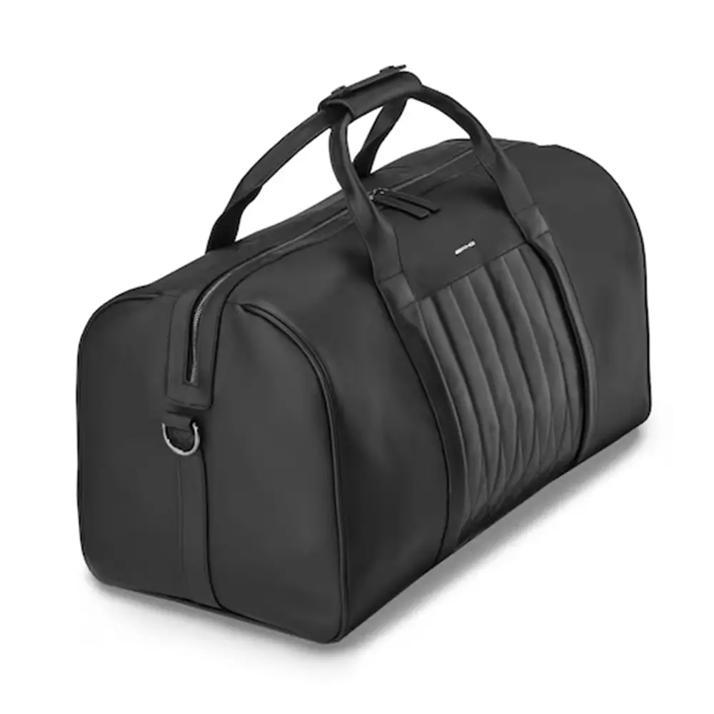 Der Mercedes-AMG Weekender in Schwarz kombiniert elegantes Design mit hoher Funktionalität. Hergestellt aus hochwertigem Rindleder, bietet er ausreichend Platz für Kleidung und Schuhe – ideal für Wochenendtrips oder Geschäftsreisen. Das silberfarbene Futter mit AMG Rapport und die beidseitige Sitzmustersteppung im Leder machen den Weekender zu einem stilvollen Begleiter.