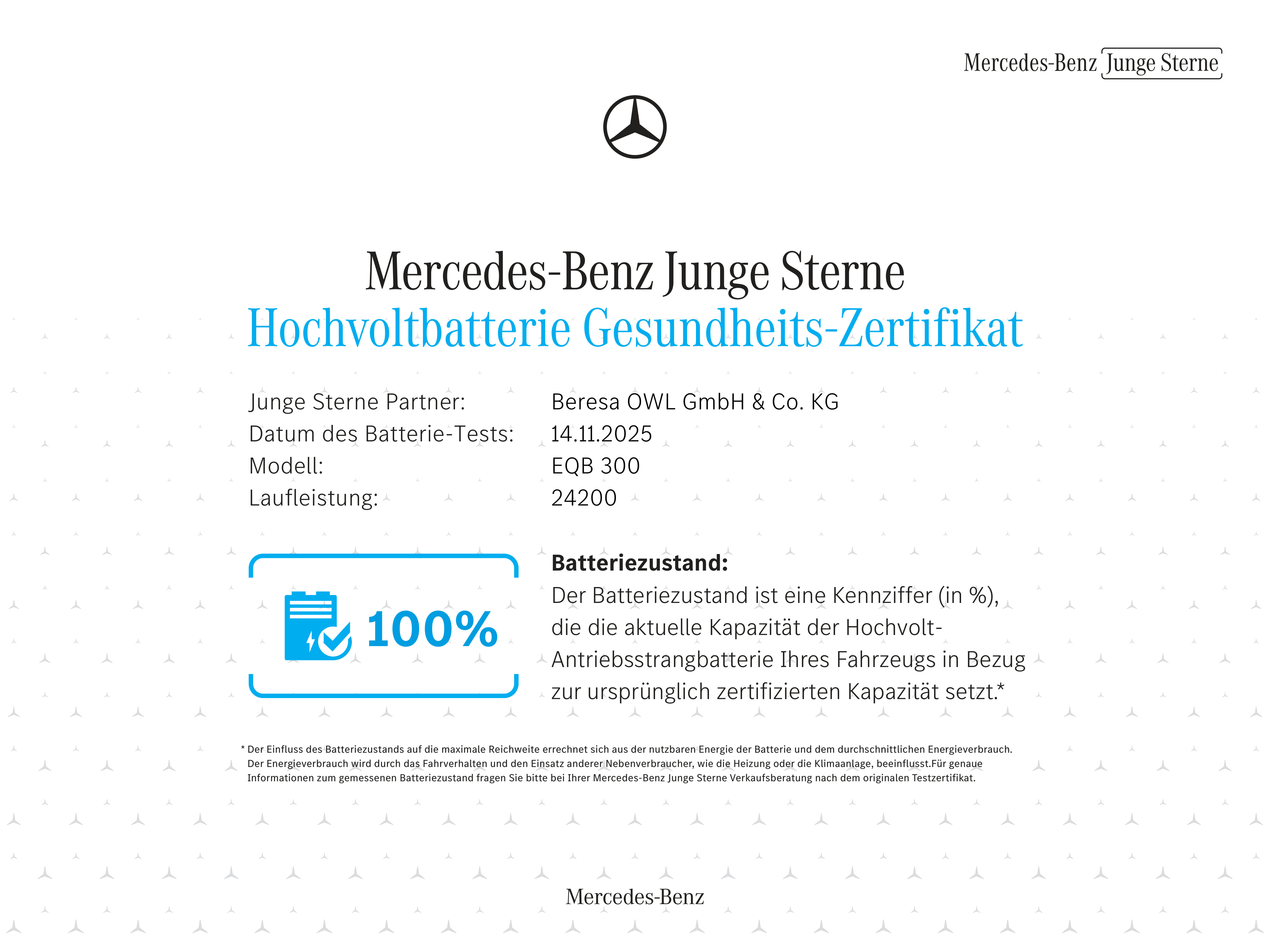 - ZERT Das Fahrzeug verfügt über ein Batterie Zertifikat