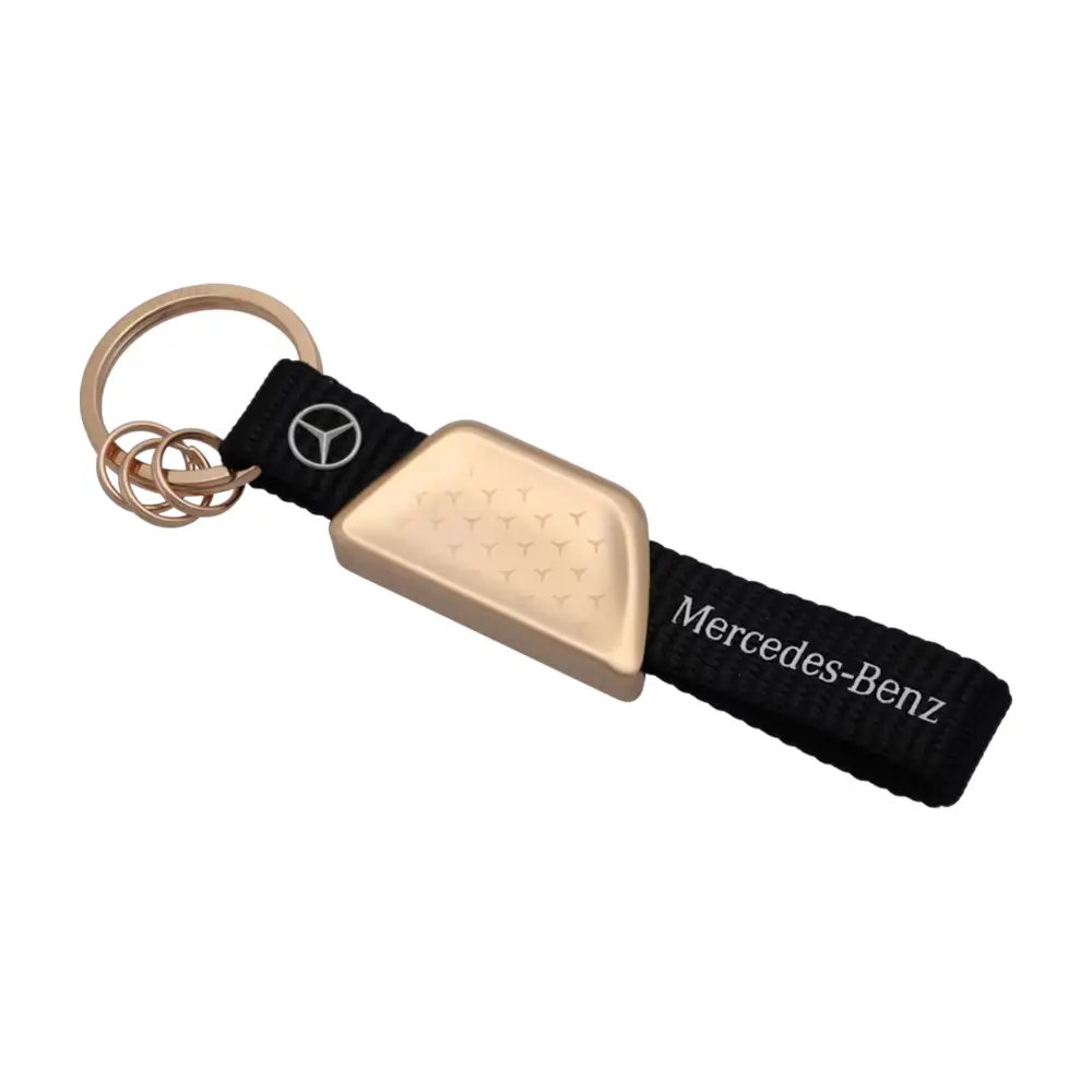 Eleganz trifft Nachhaltigkeit: Der Mercedes-Benz Schlüsselanhänger kombiniert stilvolles Design mit praktischer Funktionalität. Die schwarze Textilschlaufe aus recyceltem PET wird durch ein dynamisch geformtes, roségoldfarbenes Metallteil mit Mercedes-Benz Pattern ergänzt. Ein großer Spaltring aus Edelstahl sowie drei zusätzliche kleine Spaltringe ermöglichen ein einfaches Anbringen und Entnehmen einzelner Schlüssel.
