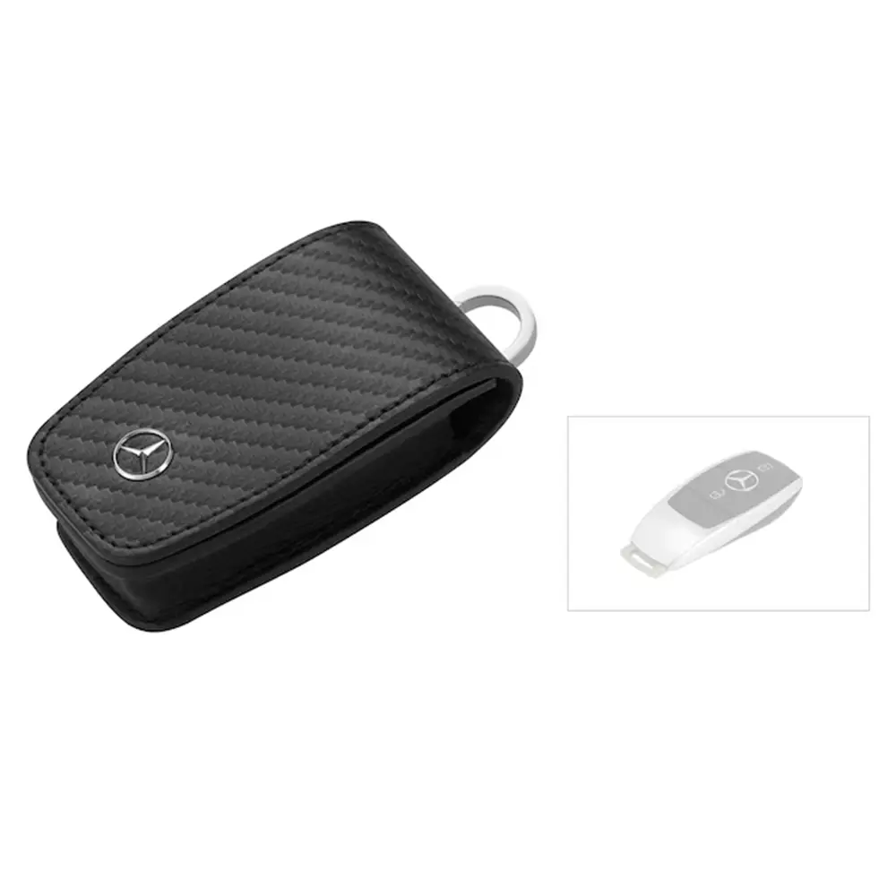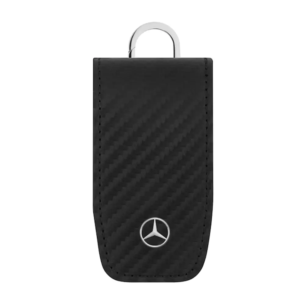 Eleganz trifft Funktionalität: Das Schlüsseletui aus hochwertigem Carbonleder mit Edelstahl-Elementen sorgt für eine stilvolle und sichere Aufbewahrung Ihrer Schlüssel. Der praktische Magnetverschluss hält das Etui zuverlässig geschlossen, während drei zusätzliche Minispaltringe das schnelle Wechseln und Entnehmen einzelner Schlüssel ermöglichen. Optisch überzeugt das Etui mit einer aufgesetzten 3D-Sternniete und einer Mercedes-Benz Lasergravur auf dem Flachspaltring.